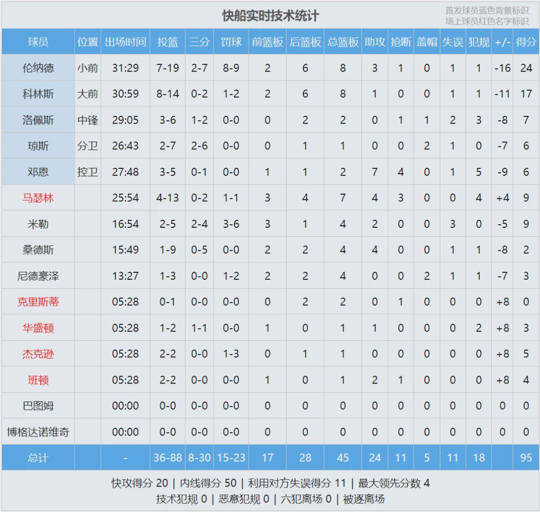 杜兰特22中8得26分6板3断5失误,申京14中9拿到22分7板5助3失误,谢泼德10中6拿到16分6板4助4失误。伦纳德19中7得24分8板3助1断,连续32场砍下20+。马瑟林13中4拿到9分7板4助3断,手感一般,但是在场上活力十足。