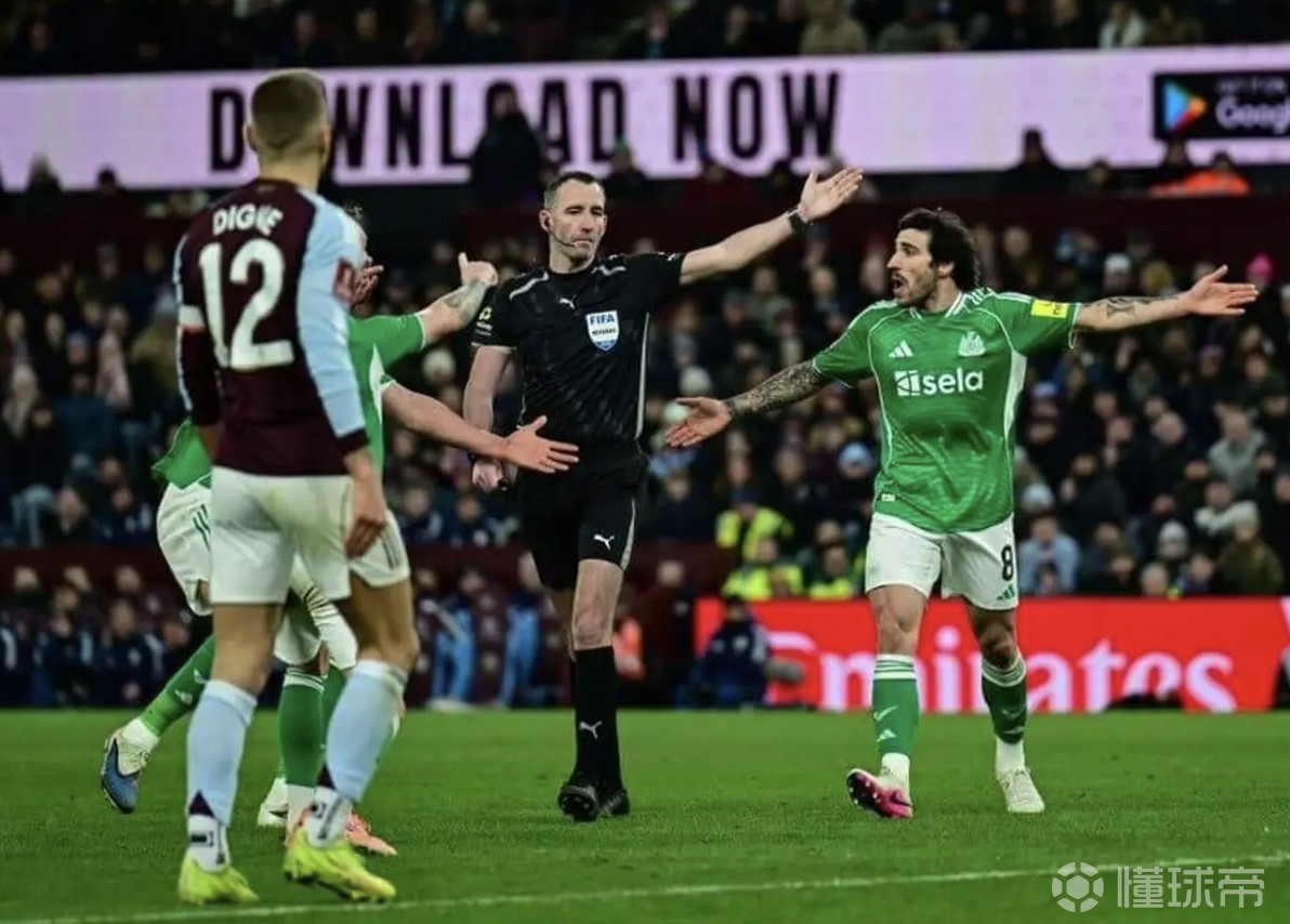 比赛还出现了维拉门将比佐上半场因鲁莽犯规被罚下的情况。最受关注的争议判罚是迪涅在自家禁区内几码处手球,却被判罚禁区外任意球。