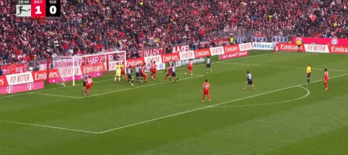第20分钟,斯塔尼希奇摆渡,凯恩头球破门,拜仁2-0法兰克福