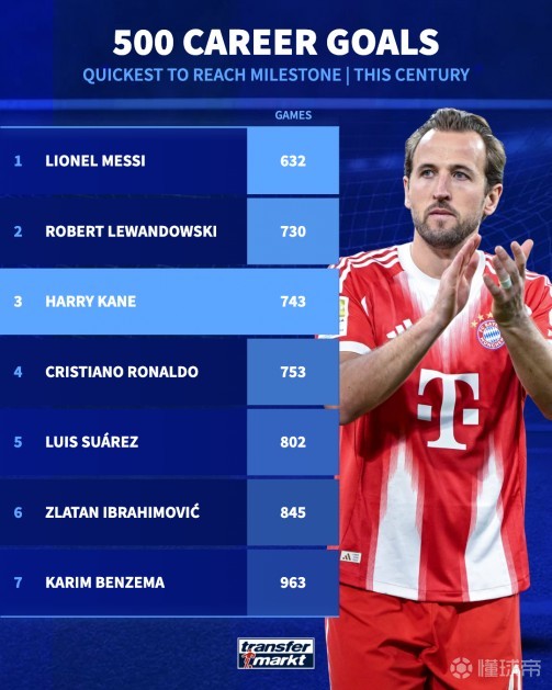 值得一提的是,凯恩仅用743场比赛,便达成了职业生涯500球成就。自2000年以来,世界足坛仅有7位球星成功解锁职业生涯500球里程碑,而凯恩则成为了达成这一目标第三快的球员。排在榜首的是梅西,这位巴萨传奇仅用632场比赛就打进了500球,如今38岁的他依旧状态火热,职业生涯总进球数已达到902球。排名第二的是莱万多夫斯基,他用730场比赛完成了500球里程碑。除此之外,C罗(753场)和苏亚雷斯(802场)也成功跻身前五,伊布拉希莫维奇(845场)和本泽马(963场)紧随其后。