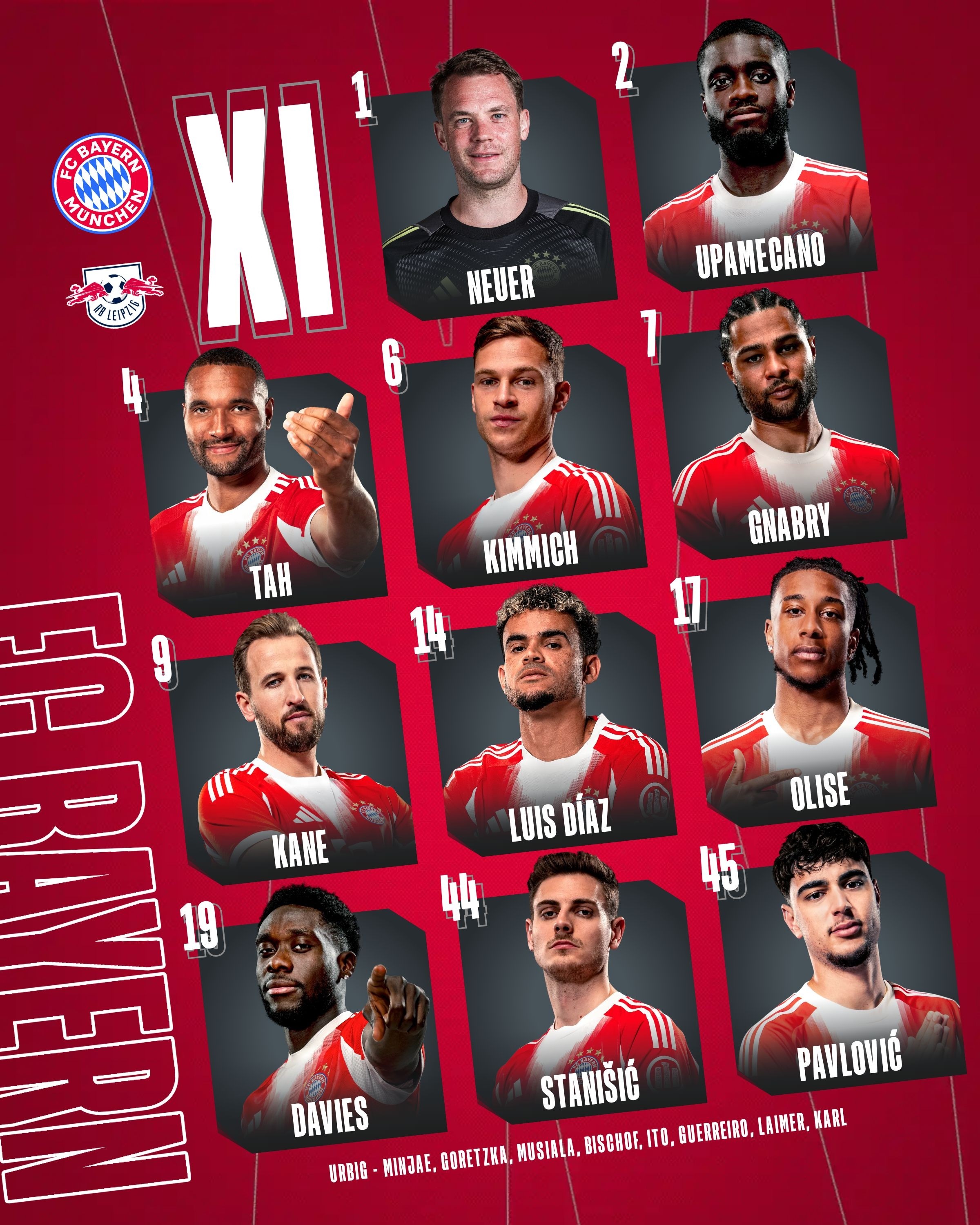 拜仁首发:1-诺伊尔、44-斯塔尼希奇、2-于帕梅卡诺、4-约纳坦-塔、19-阿方索-戴维斯、6-基米希、45-帕夫洛维奇、7-格纳布里、14-路易斯-迪亚斯、17-奥利塞、9-凯恩
