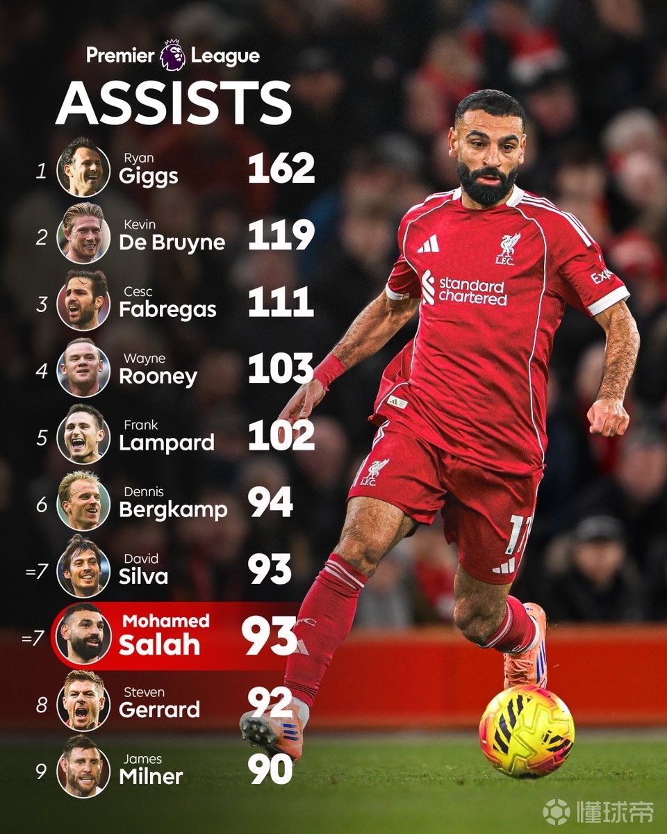 英超第26轮,利物浦客场对阵桑德兰,下半场萨拉赫助攻范戴克破门,至此,萨拉赫英超生涯已送出93次助攻,这使得他超越杰拉德,追平大卫-席尔瓦,升至英超历史助攻榜第七位。