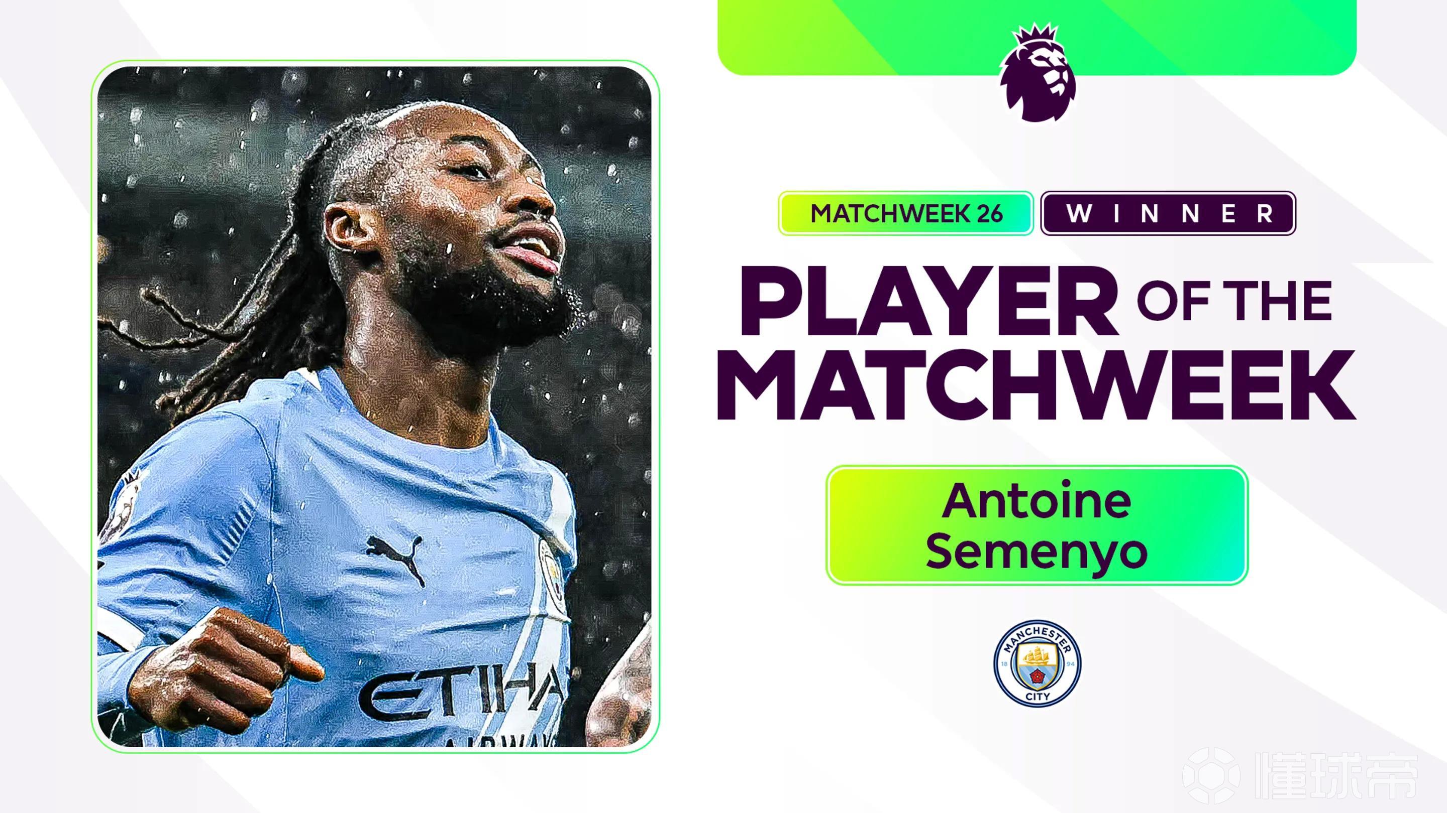 塞门约成为本赛季继哈兰德(第6轮最佳球员)和多库(第11轮最佳球员)之后,第三位获此殊荣的曼城球员。