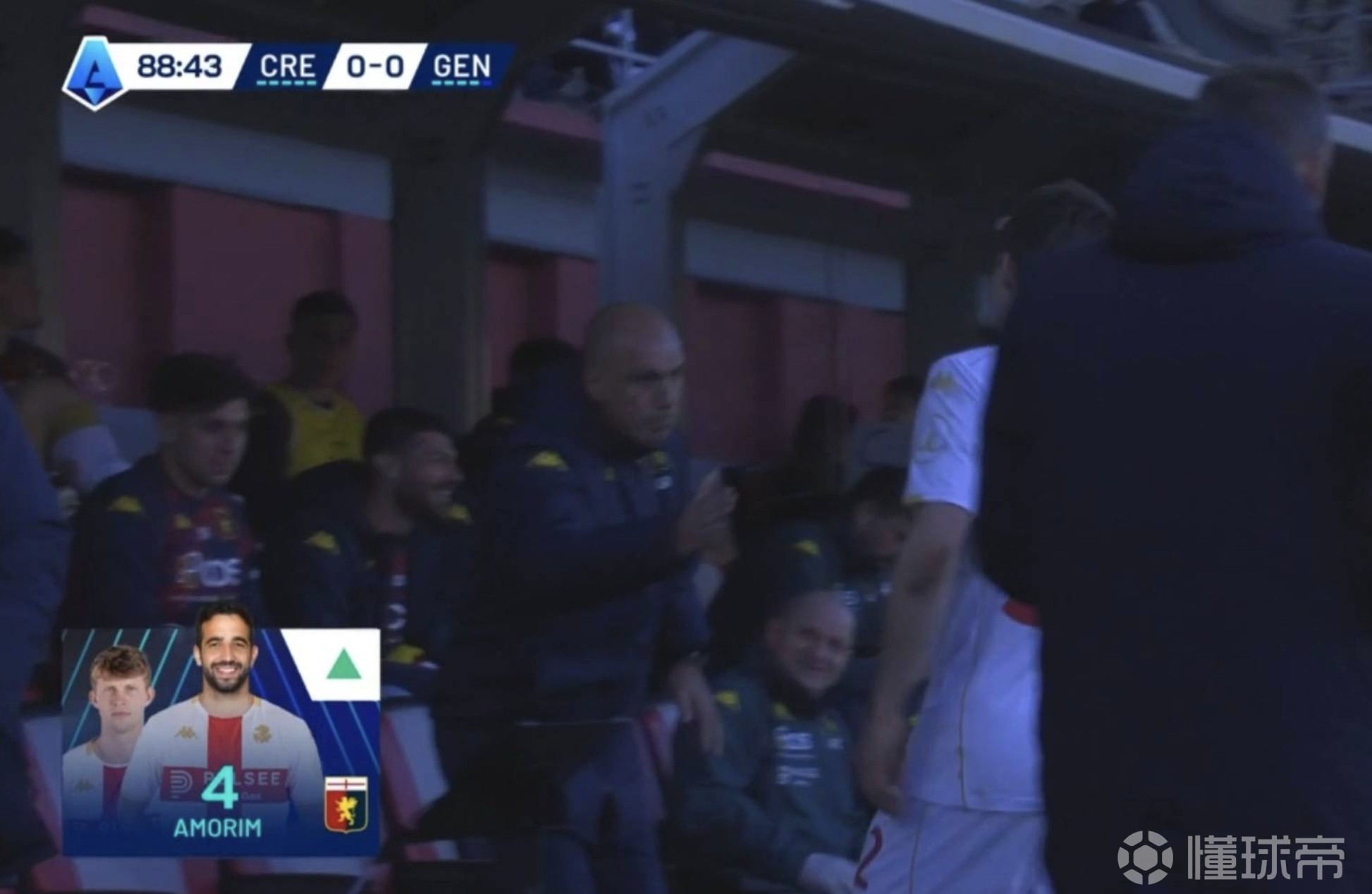比赛末段,热那亚主帅德罗西让替补席上的亚历山德罗-阿莫林起身,准备换下弗伦德鲁普。转播图像显示了两人的名字与照片:弗伦德鲁普配的是本人照片,但阿莫林那一栏却“画风不对”——头像并非年轻的热那亚中场亚历山德罗-阿莫林,而是前曼联主帅鲁本-阿莫林,他不久前刚被曼联解雇。
