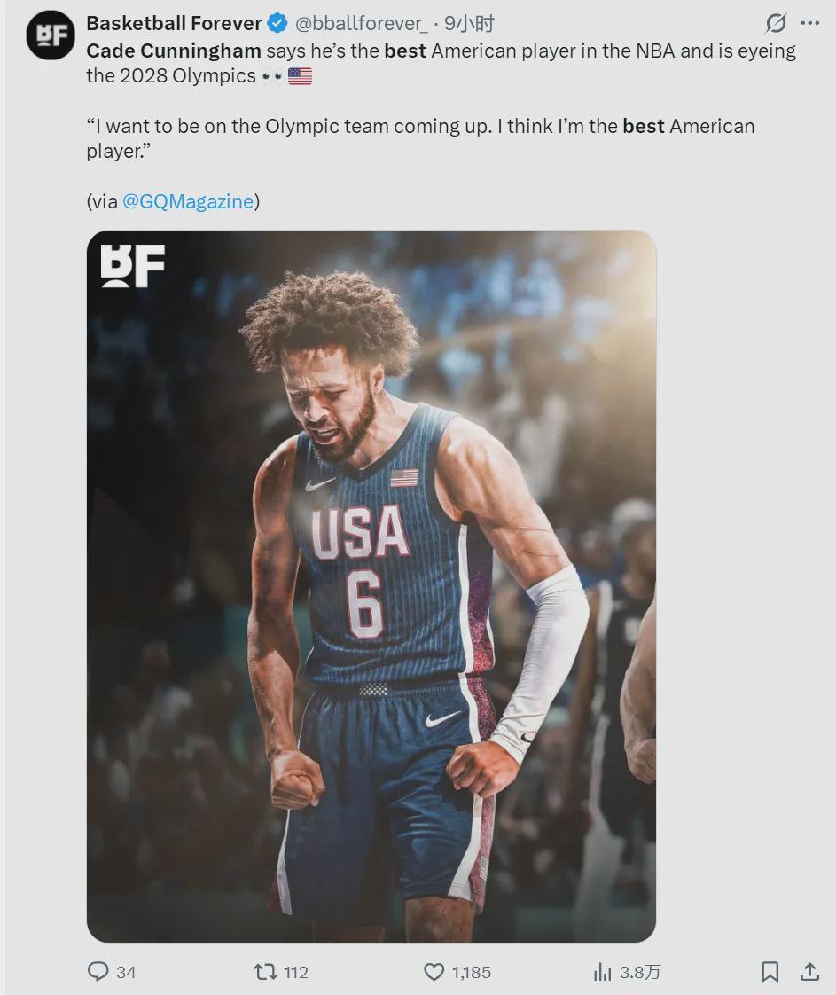 最新一期的NBA官方MVP排行榜,坎宁安依然位列第四,联盟前三分别是:亚历山大、东契奇和约基奇。近日坎宁安接受媒体采访时说道:“我想代表美国男篮出战2028年洛杉矶奥运会,我觉得自己是NBA联盟最好的美国球员!”