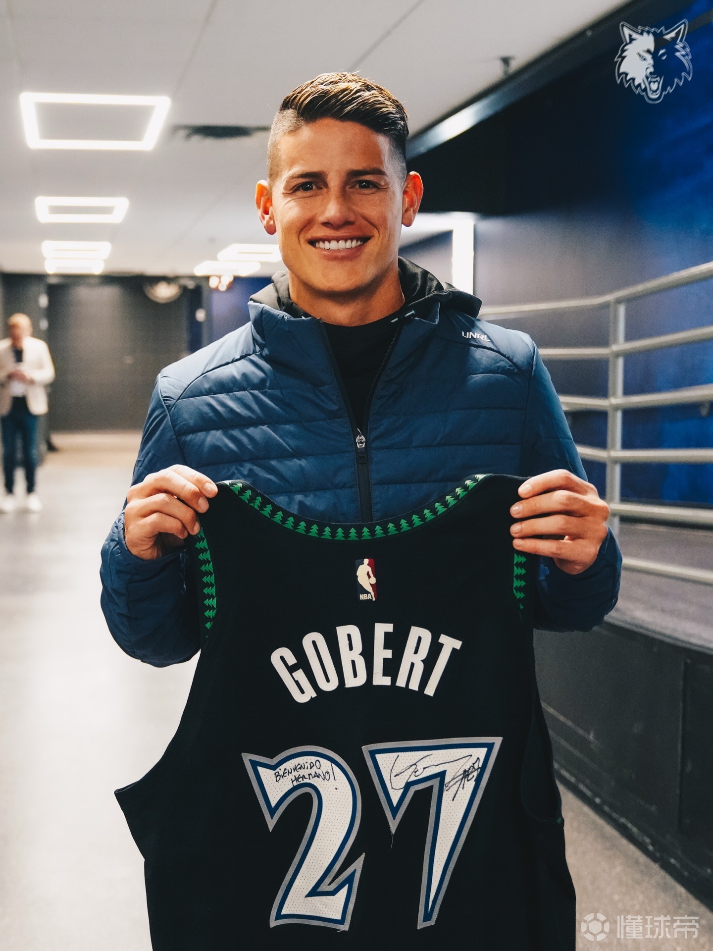 赛后,J罗与森林狼中锋戈贝尔合影留念,并送上明尼苏达联10号球衣,也获得了戈贝尔赠送的签名球衣。