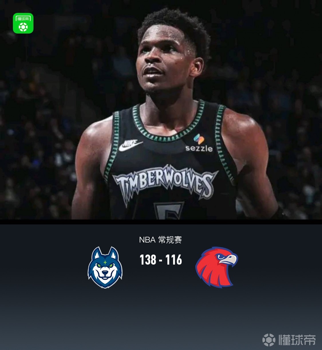 第四节森林狼多森姆拿下10分,老鹰CJ-麦科勒姆拿下12分,最终森林狼138-116战胜老鹰