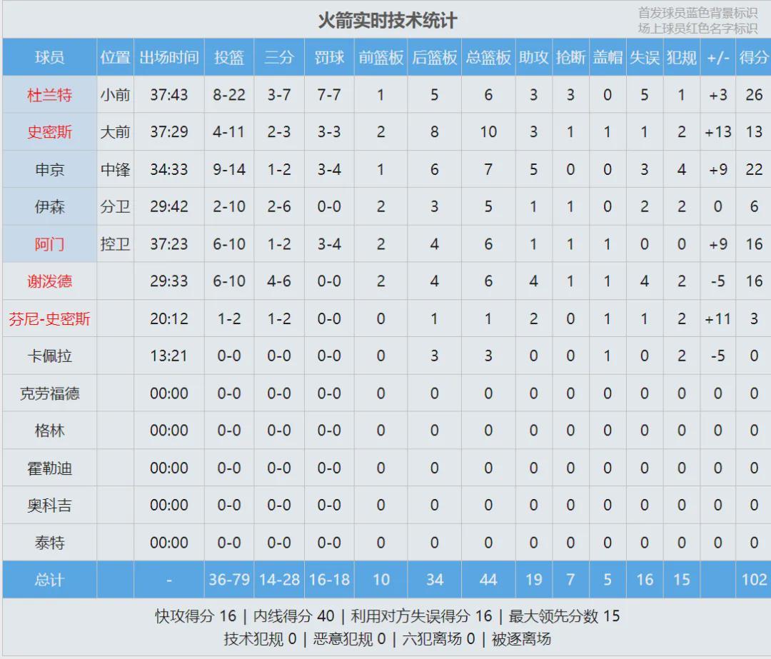 此役过后,火箭升至西部第三,落后第二的马刺3个胜场。最后看看数据: