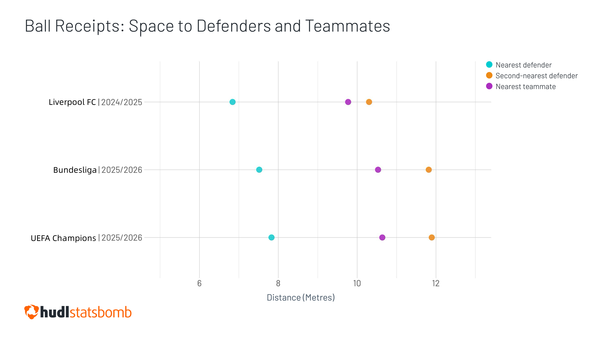 对比利物浦时期,迪亚斯在利物浦时期练就的高位逼抢意识,在孔帕尼的战术体系下得到完全释放。孔帕尼将迪亚斯的空间价值放大到了极致!通过球权接收:迪亚斯与防守球员的空间距离对比图可以清晰看见,迪亚斯在利物浦时期参与了更多防守,与防守球员的距离也更近,踢左边锋时更多地要保持随时联防的状态。而在孔帕尼麾下,迪亚斯回防深度大幅收缩,始终保持和队友足够的空间,这才有一次次获得单刀的机会,这在以往是迪亚斯并不擅长的,相信假以时日,迪亚斯的单刀水平也会大大提升。