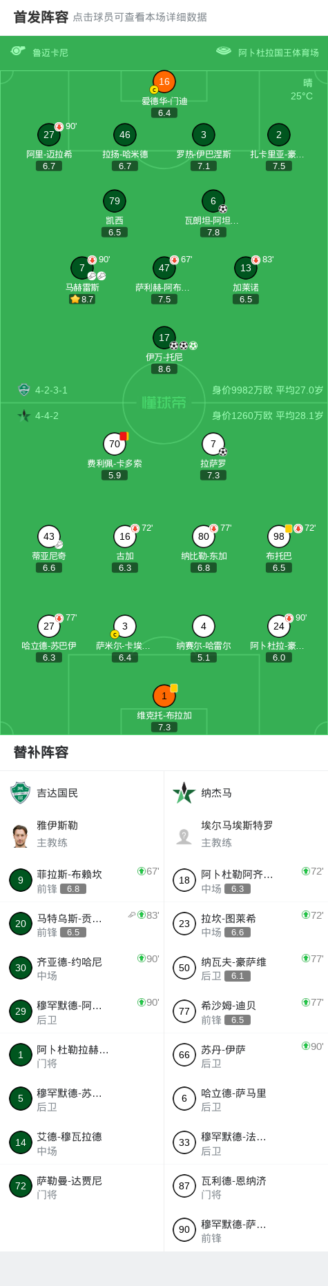 北京时间2月20日沙特阿拉伯联 联赛 第23轮,吉达国民主场对阵纳杰马。吉达国民瓦朗坦-阿坦加纳破门,伊万-托尼帽子戏法。纳杰马拉萨罗破门。最终比分吉达国民 4-1 纳杰马。