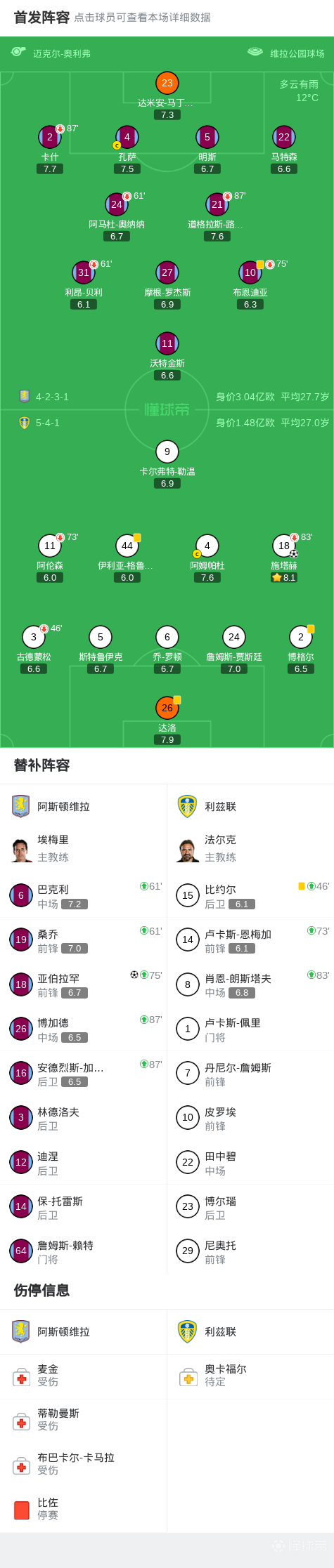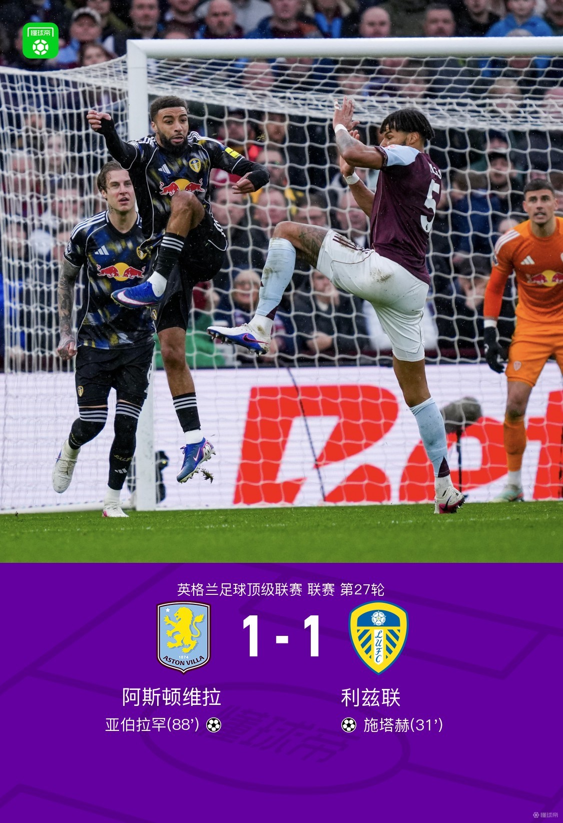 北京时间2月21日英格兰足球顶级联赛第27轮,阿斯顿维拉主场对阵利兹联。施塔赫任意球率先破门,亚伯拉罕比赛尾声扳平。最终比分阿斯顿维拉1-1利兹联。