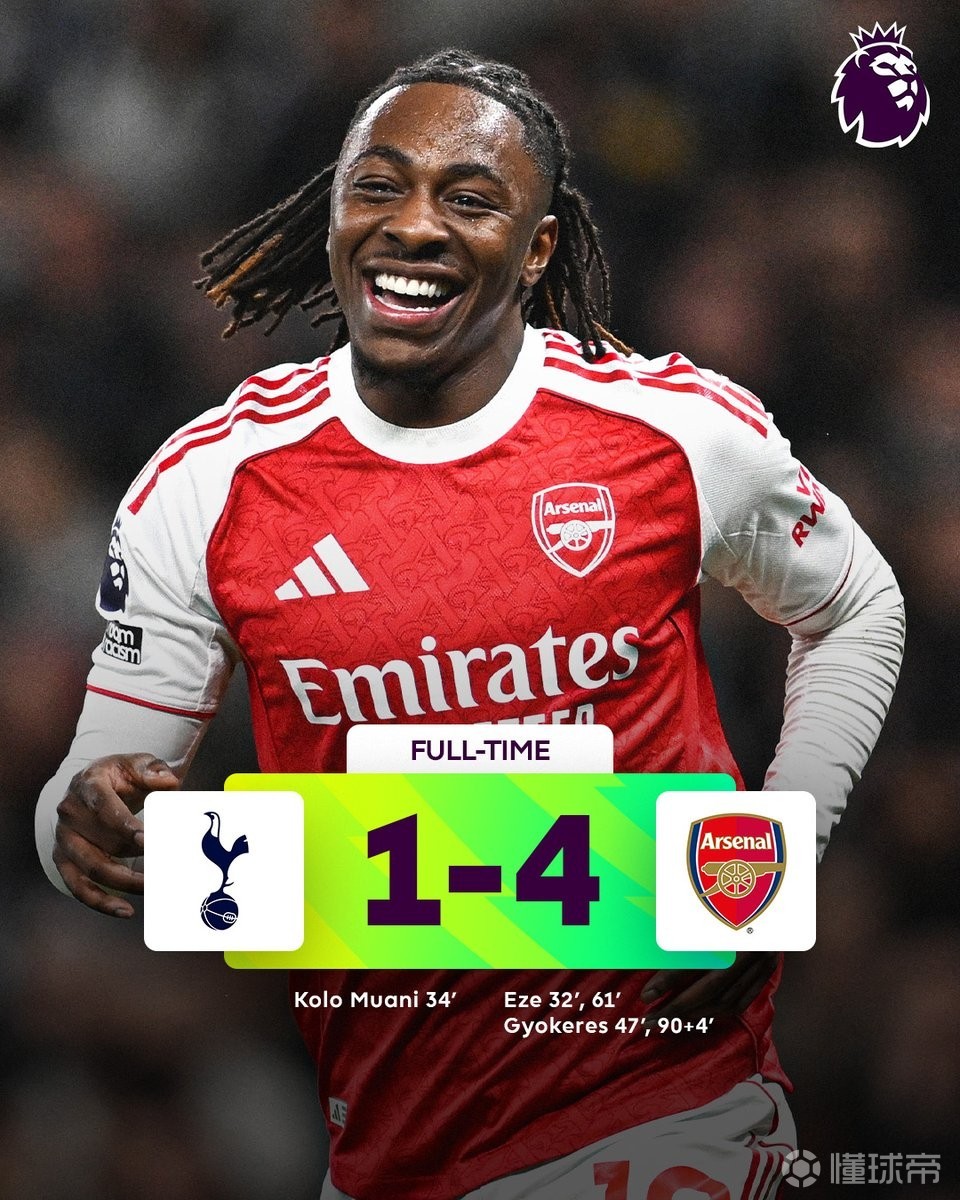 此役客场对阵热刺,阿森纳凭借埃泽和哲凯赖什分别上演梅开二度,以4-1的比分击败对手。
