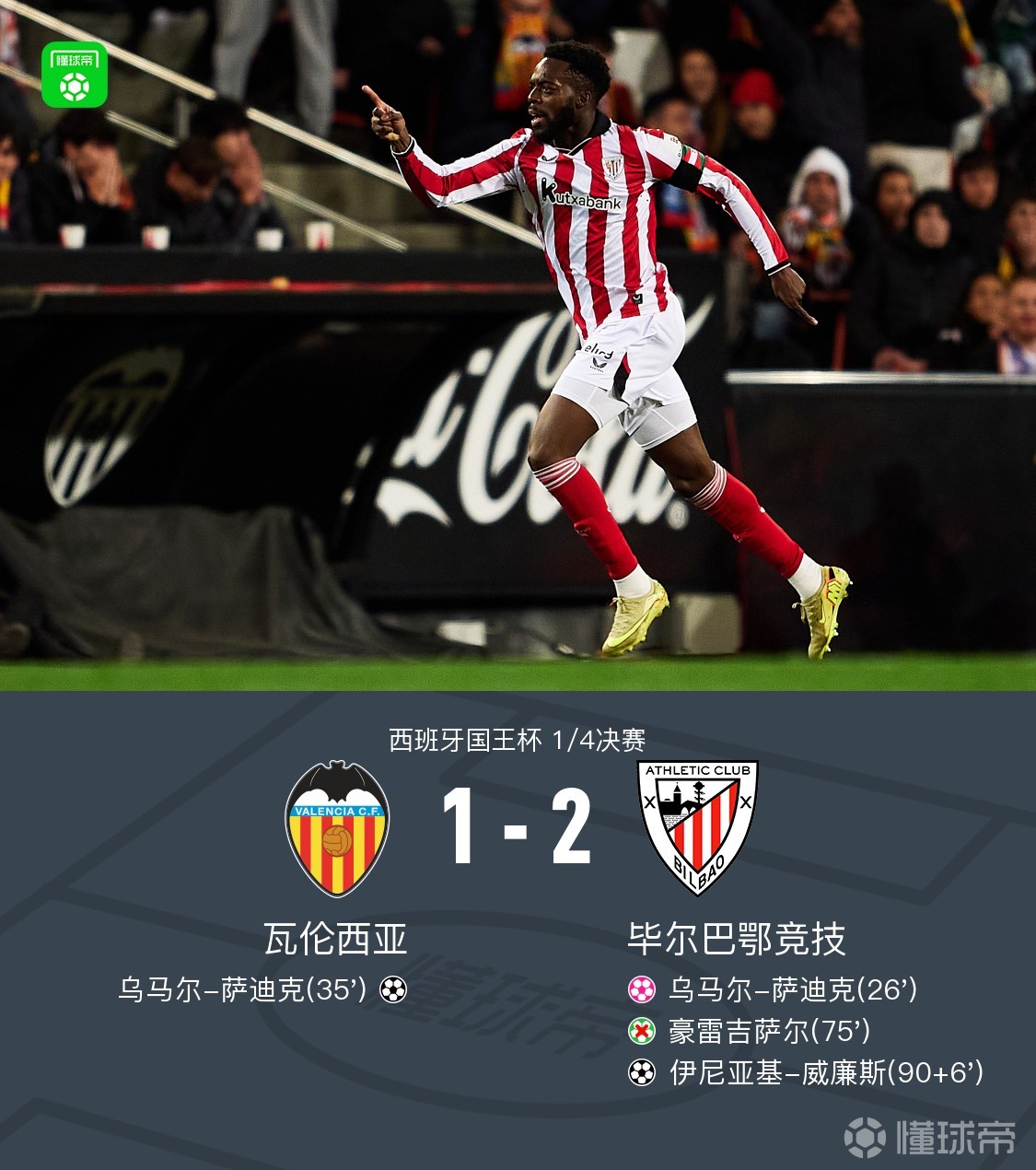 北京时间2月5日西班牙国王杯 1/4决赛,瓦伦西亚对阵毕尔巴鄂竞技。瓦伦西亚乌马尔-萨迪克破门,乌马尔-萨迪克自摆乌龙。毕尔巴鄂竞技伊尼亚基-威廉斯破门。最终比分瓦伦西亚 1-2 毕尔巴鄂竞技。